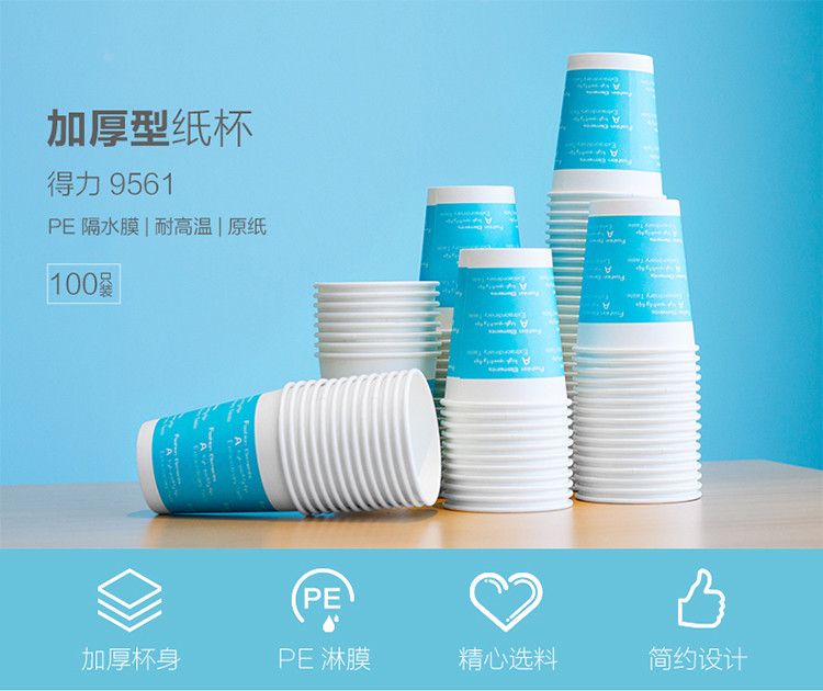>得力(deli)250ml(9盎司)加厚一次性水杯纸杯 100只装 办公用品 蓝色9561