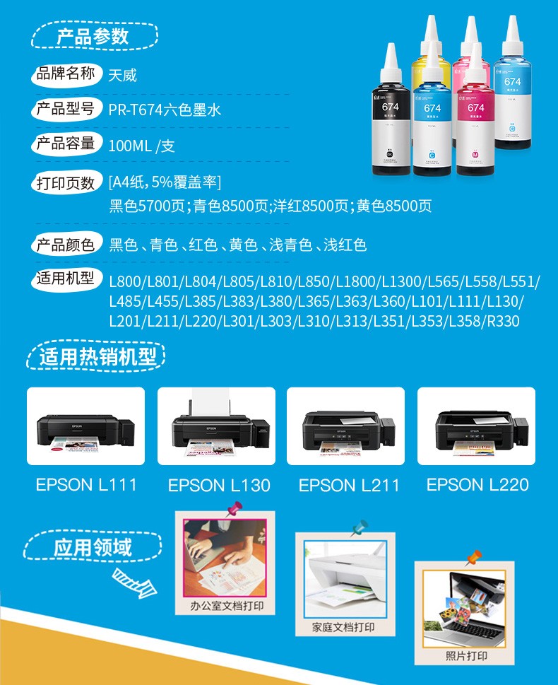 当前位置: 首页>耗材>其他耗材>墨水>天威 PR-T674 墨水 适用爱普生L805 850 1800 810 801 360 101墨仓式打印机 6色墨水