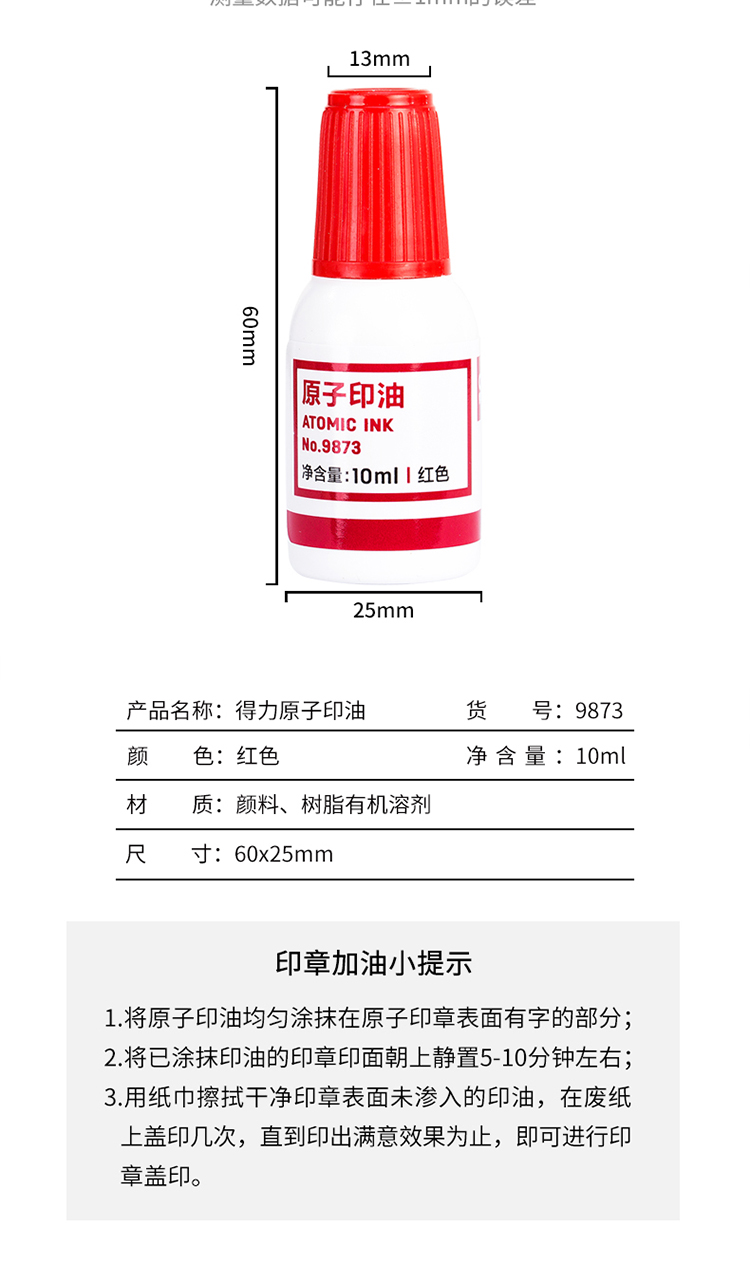 >得力(deli) 9873 印台/印泥/印油 10ml财务印章原子印油 红色原子印章油 办公用品 9873